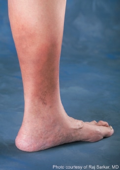 Skin discoloration is often first noticeable around the ankles or low calves, but also frequently occurs over the shins and on the feet.